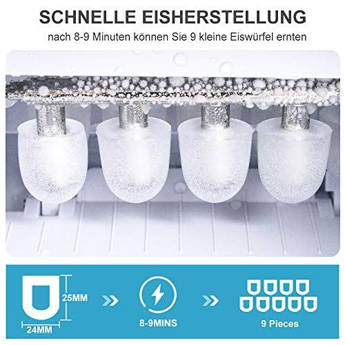 🧊【SCHNELLE EISERZEUGUNG】 Wasser in Wassertank (1.5L) einschütteln, transparenten Deckel Generalisieren und demzufolge ICE MAKING drücken. Jedes Mal 9 Abschnitt Eiswürfel in 8 Minuten (das erste Mal kann ein paar Minuten langsamer sein) hergestellt. In Folge dessen können Sie rund um die Uhr 12 kg Eis bekommen und ganztägig Erfrischungen für Ihre Party anbieten.
