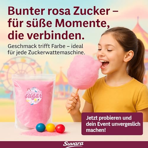 100g Profi Farbzucker Rosa mit dem Aroma Bubble Gum erhalten Sie einem lebensmittelechten Vakuumbeuteln mit einer Mindesthaltbarkeit von mindenstens 6 Monaten. Zuckerwatte Zucker für Ihre Zuckerwattemaschine mit den Aromen und der Farbe: Apfel – Grün, Apfelsine – Orange, Banane – Gelb, Bubble Gum – Rosa, Heidelbeere – Breit, Kirsche – Rot, Pina Colada – Gelb, Traube – Lila, Vanille – Pink und Zitrone – Gelb ist bekannt als bei uns erhältlich.