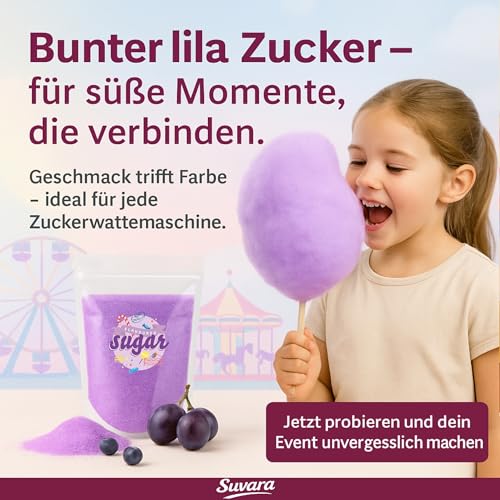 Leckere selbstgemachte lila Zuckerwatte mit Traubengeschmack, ist mit unserem Aromazucker kinderleicht herzustellen. Einfach den Aromazucker „Lila mit Traubengeschmack“ direkt in Ihre Zuckerwattemaschine geben und es entsteht, auf einfache Weise, Lila nach Traube duftende Zuckerwatte. Wie auf dem Jahrmarkt. Einfacher geht es nicht. Dieser Aromazucker „Lila mit Traubengeschmack“ ist eine „Fertigmischung“ und somit für den sofortigen Einsatz (ohne lange Vorbereitung) passend.